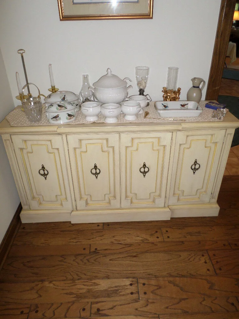 SALE HIGHLIGHTS: Three-piece living room set by EJ Victor, including sofa and two chairs, Schinoisserie cabinet by White Furniture, Schinoisserie lighted china cabinet, Kumihimo Maruhai stands, leather three-piece set, including sofa, loveseat, chair and ottoman, Hooker wine cabinet/buffet, French Provincial dining room set by Martinsville with six cane back chairs, three leaves, buffet and china cabinet, Coffee table, two end tables and a sofa tables with two stools by Gordon’s, pair of floral wing chairs, blue leather barca lounger, Drexel bedroom set, including king bed, dresser, gentleman’s chest and two night stands, Thomasville bedroom set, including two night stands, three-piece bookcase/TV cabinet combo and dresser, French Provincial bedroom set, including king bed, two night stands, dresser with double mirror, bookcase and two pedestal side tables, brass king bed, pair of figural lamps, table and floor lamps, including Rembrandt, loom by Schacht Spindle Co., rattan sofa with end table and coffee table, mahogany expandable table/chest combo, two tufted faux leather chairs, leather captain’s chairs with nailhead trim, eight retro swivel bar stools, two faux leather bar-height stools, custom regulation size pool table by Golden West Billiards with accessories, Tiffany style lamp, rattan bakers rack, brass trimmed bakers rack, Sony 54inch flat screen TV, Samsung TV, Ethan Allen stenciled tea cart, maple drop leaf table, Whirlpool duet washer/dryer combo on pedestals, Admiral washer/dryer set, cherry side table, maple desk, Ethan Allen desk, office chair, cedar chest, Bentwood rocker with matching stool, four Hitchcock chairs, Demi Loom cabinet with slate top, Boehm porcelain bird, Sevres tall vase, collector’s plates by Daum, Lalique, Wedgwood and Lenox, P. Buckley Moss framed wall art, Amana electric stove, refrigerator, large assortment of metal outdoor furniture, iron outdoor furniture, Weber charcoal grill, Toro electric leaf blower, Toro electric snow thrower, metal fire pit, leather bound books, collection of large cribbage boards, crystal, including Waterford, kitchen items, including Noritake china, Hall china, Correll, Denby and Dansk wooden items, Oneida stainless flatware, Corning Ware, Keurig coffee maker, Kitchen Aid toaster, Rogers silver plate set, plate chargers, linens, CD’s, LP’s, Pioneer stereo receiver, baskets, including Longaberger and Carnation, Bose wave radio, large Amish quilt, women’s purses, including Burberry, Gucci, Dooney and Bourke and Stone Mountain, women’s clothing, including Lauren, Talbots and Stern & Manns, scarves, jewelry, men’s hats, luggage, skittle game, board games, exercise trampoline, treadmill, dart board, croquet set, folding chairs, wooden shelves, Veeco 400 vintage hair dryer, garden and hand tools, step stools, bird houses, coolers, hand truck, plastic storage containers, life jackets and so many more items that we cannot possibly mention!!